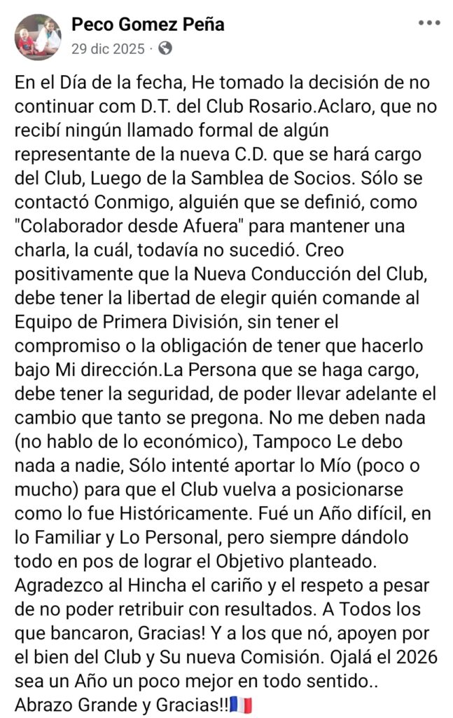 Rosario es otro de los que varió su Director Técnico. En el elenco puntaltense asumió la nueva dirigencia y se encontró con la renuncia de Federico Gomez Peña